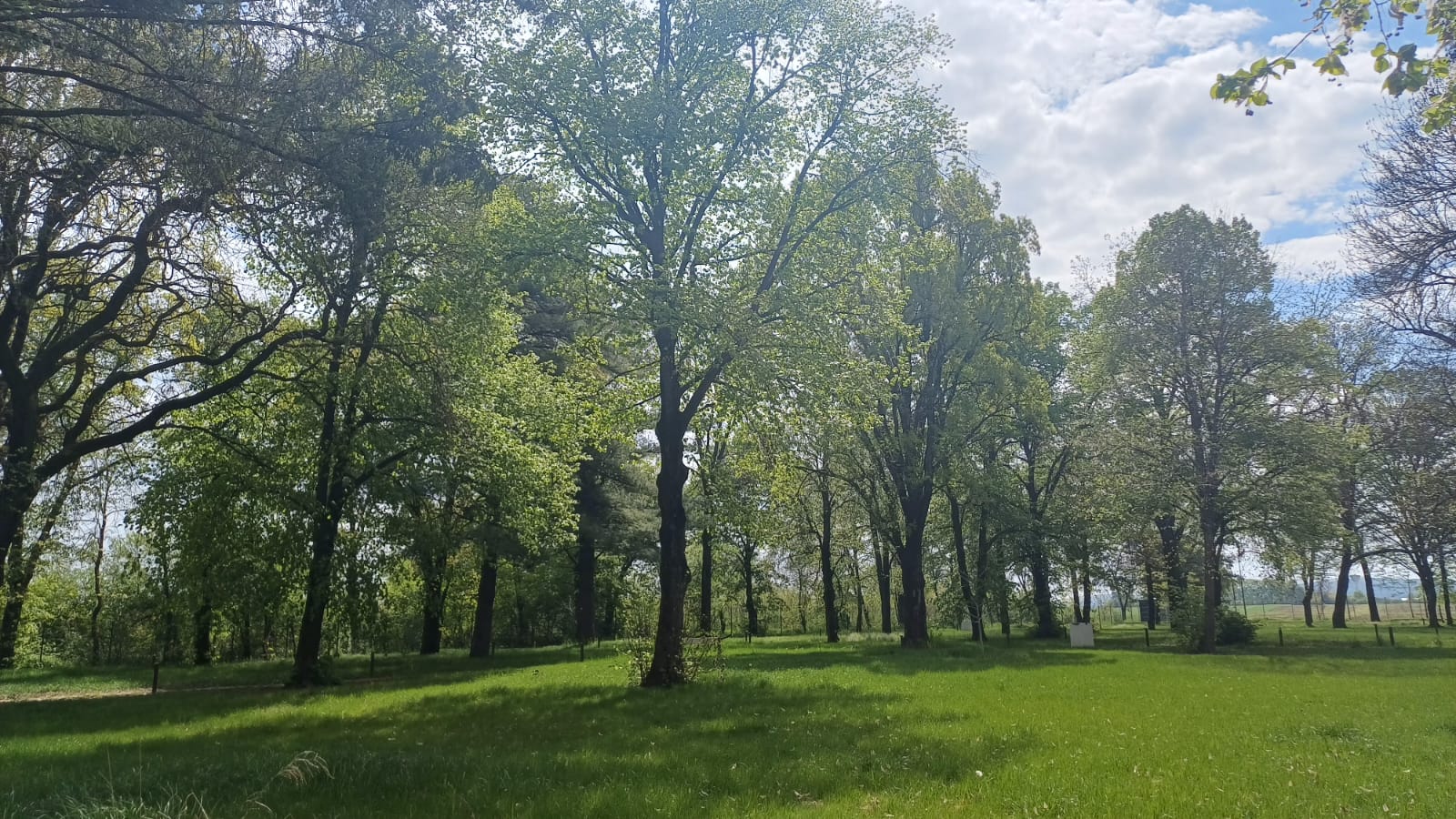 Arhitectură peisageră: Aleile pavate cu piatră sunt străjuite de copaci ornamentali aflați în plină floare, oferind un spectacol vizual rar întâlnit în zona periurbană.