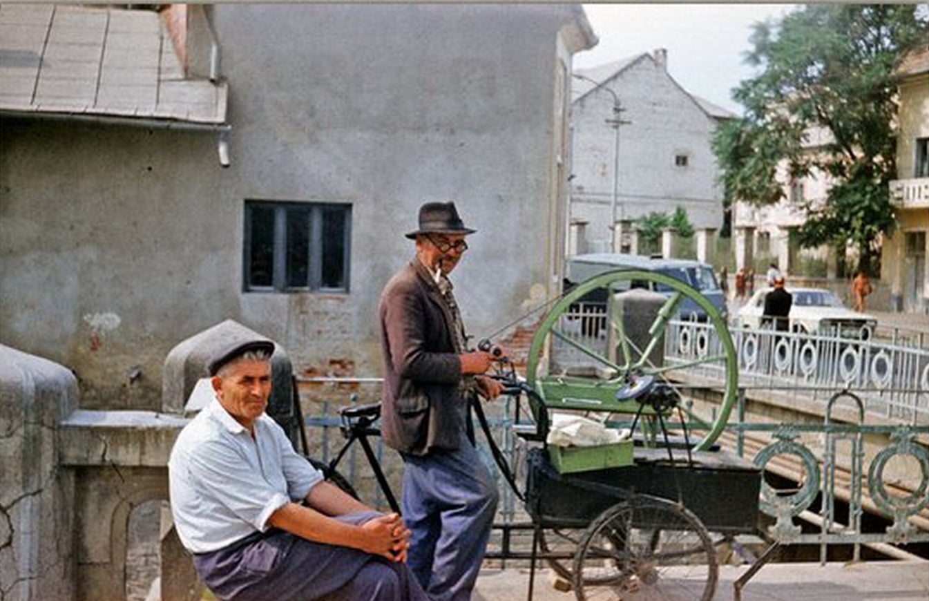 Fotografia de arhivă publicată de I LOVE Turda ne transportă exact în acea epocă, pe podul de peste Valea Racilor. Aici, în inima orașului, tocilarul își instala „laboratorul” mobil: un dispozitiv ingenios, adesea montat pe un cadru de bicicletă sau o structură cu pedale, care punea în mișcare marea roată verde — polizorul.